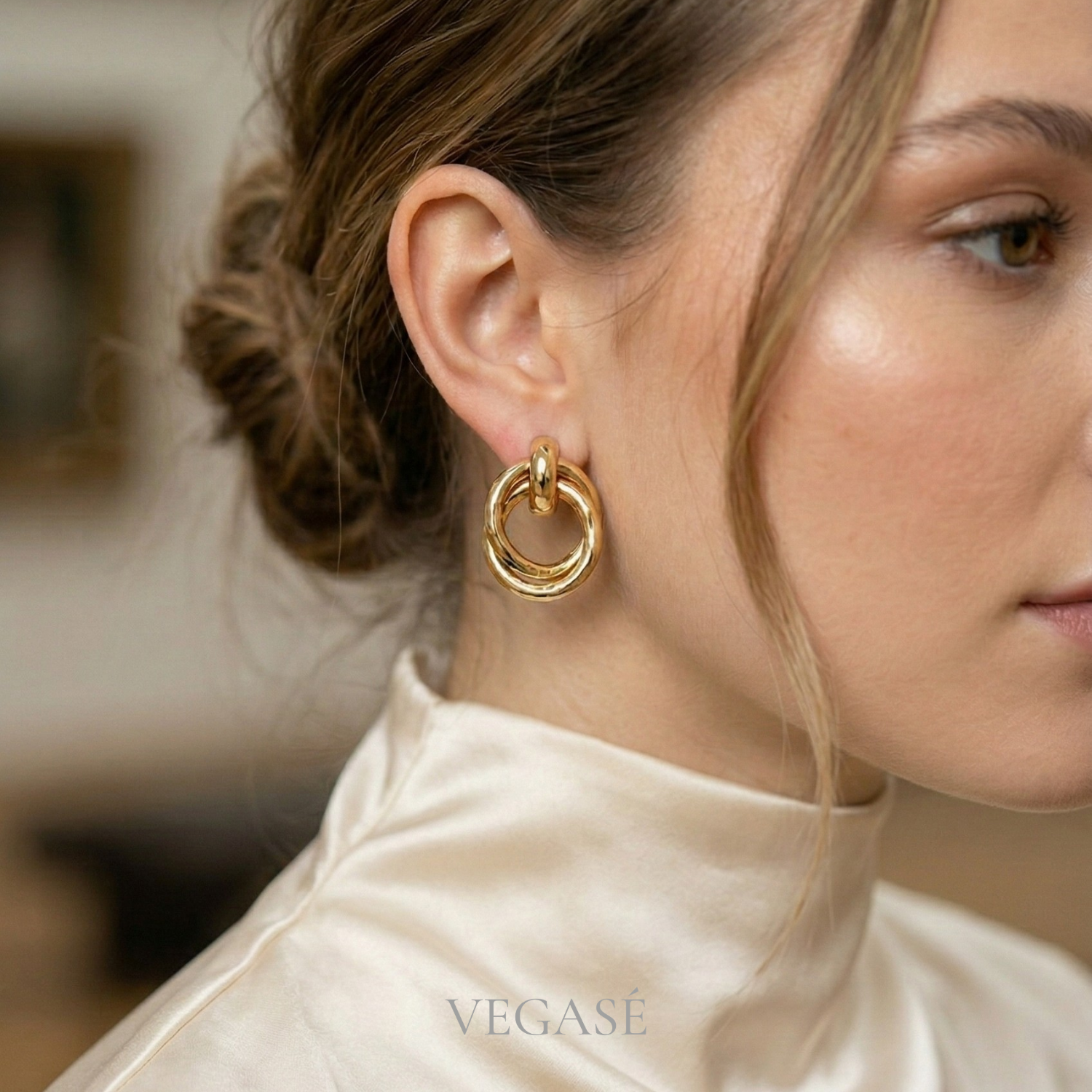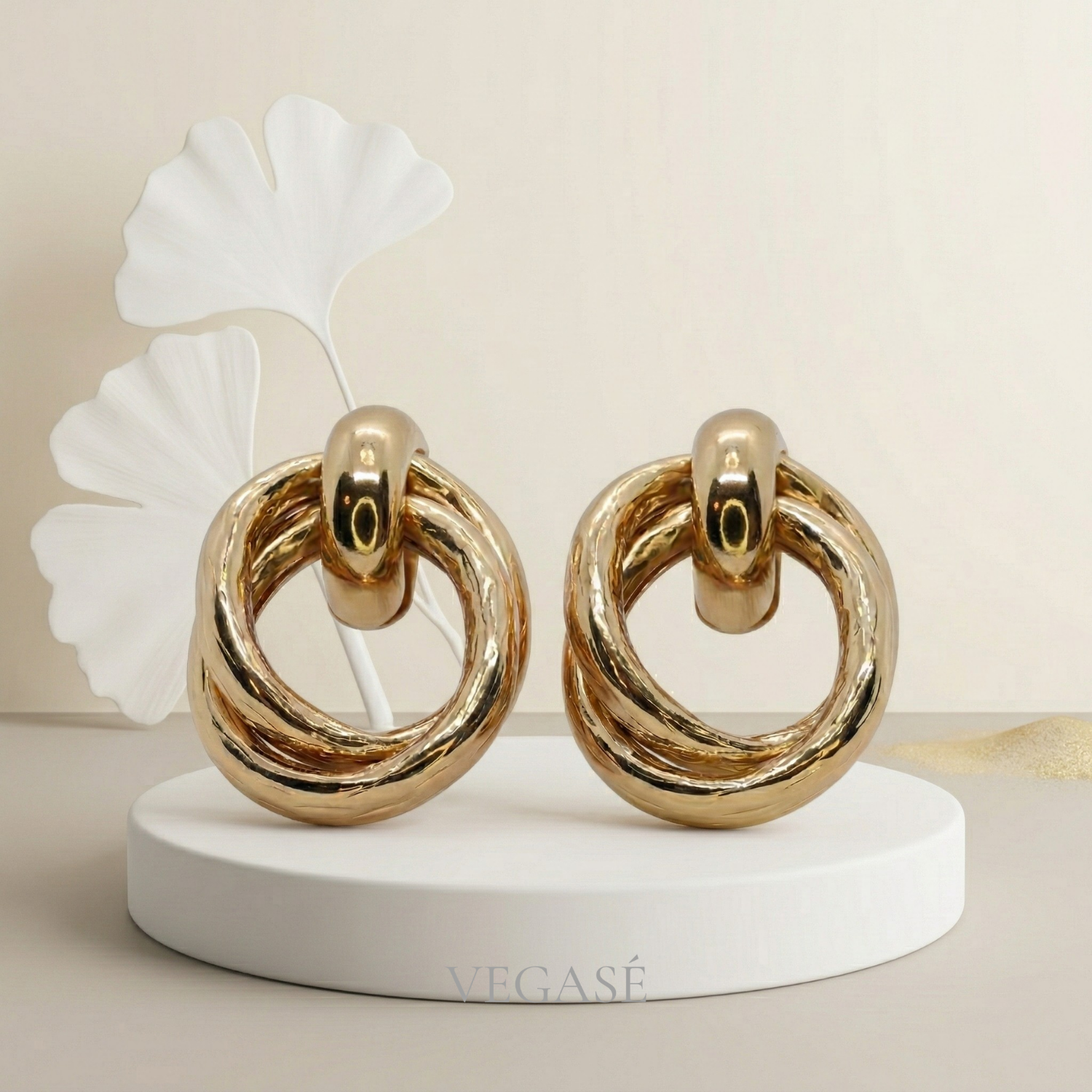 Dualé Küpe, iç içe geçmiş halka formuyla modern şıklığın güçlü bir yorumudur. Parlak gold yüzeyi ışığı her açıdan yansıtarak sofistike ve iddialı bir görünüm sunar.