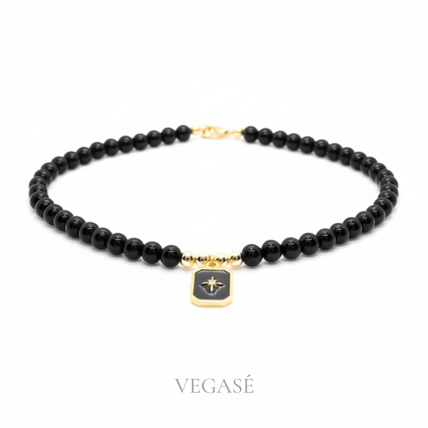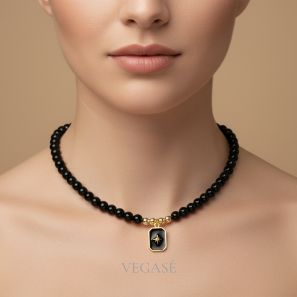 Modern ve güçlü bir duruşu yansıtan Eterna Siyah Boncuklu Kolye, parlak siyah boncuk dizilimi ve gold renk detaylarıyla dikkat çekici bir tasarım sunar. Kolye merkezinde yer alan çokgen formdaki gold çerçeveli siyah plaka ve üzerindeki zarif yıldız motifi, tasarıma karakteristik bir imza kazandırır. Gold ara boncuklar, siyahın derinliğiyle kontrast oluşturarak dengeli ve sofistike bir görünüm sağlar.