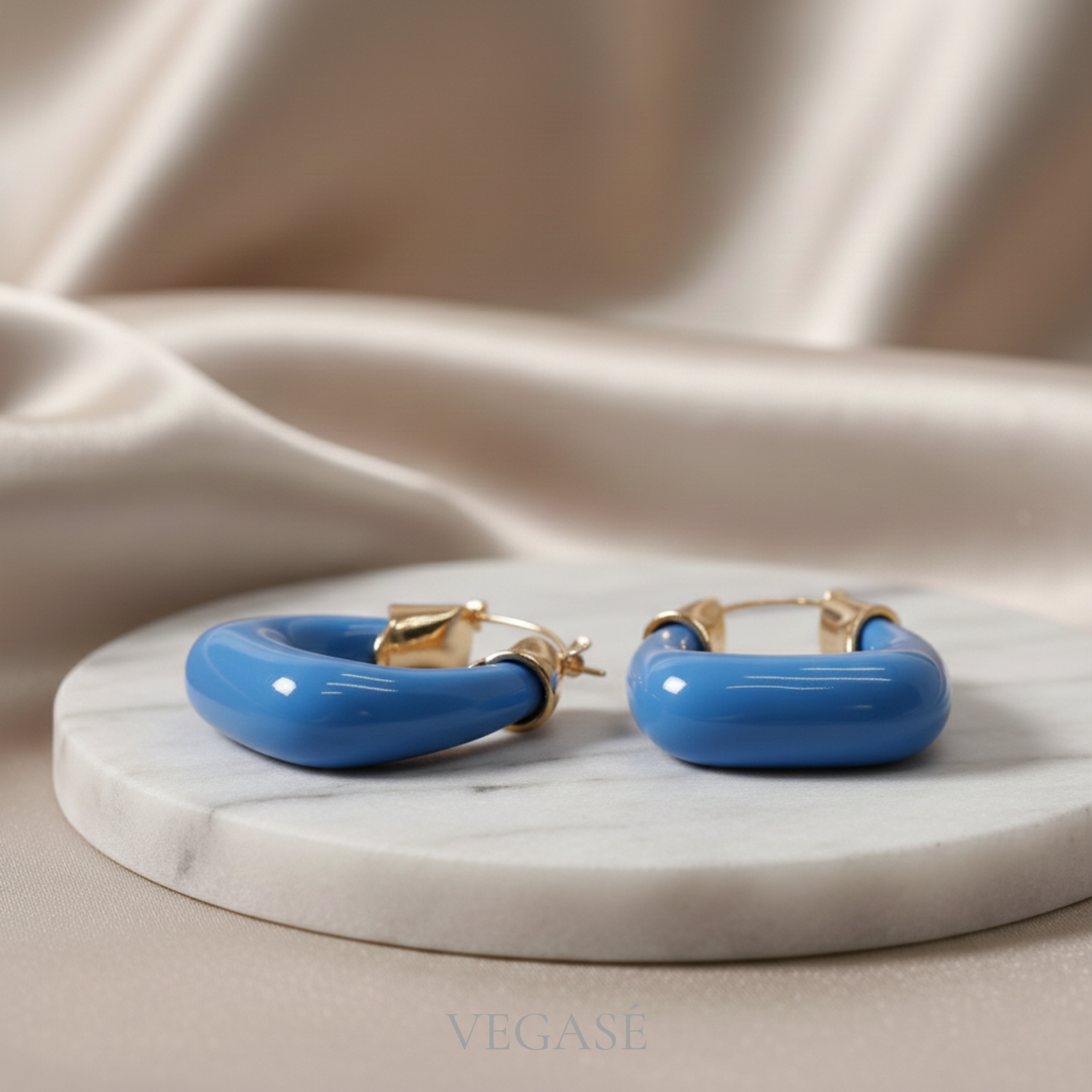 Canlı mavi yüzeyi ve altın tonlu metal detayları, küpeye sofistike bir kontrast kazandırır.