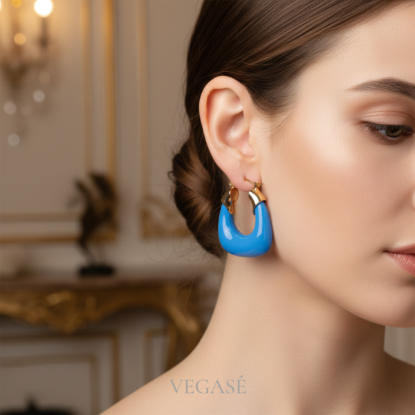 Mira Küpe, modern formu ve canlı mavi tonu ile stiline cesur ama dengeli bir dokunuş katar.