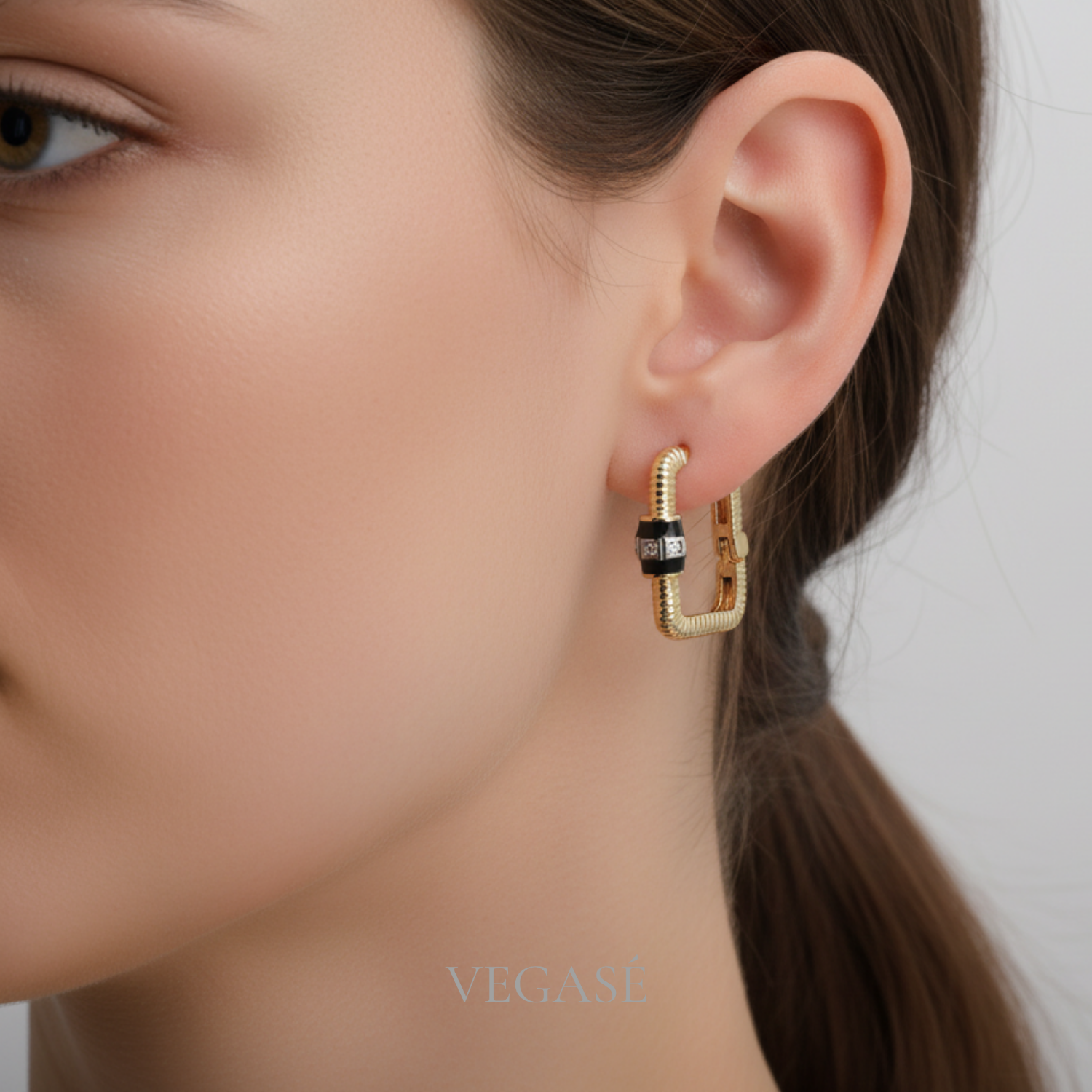 Minimal ama karakterli tasarımı sayesinde hem günlük kombinlerde hem de şık akşam stillerinde rahatlıkla kullanılabilir. Siyah detayın kattığı kontrast küpeye güçlü bir vurgu kazandırırken gold renk yüzey zamansız bir şıklık sunar. Kararmaya dayanıklı çelik materyali sayesinde uzun süre parlaklığını ve formunu korur. Daha uzun ömürlü kullanım için parfüm, krem ve benzeri kimyasal ürünlerle doğrudan temas ettirilmemesi önerilir.