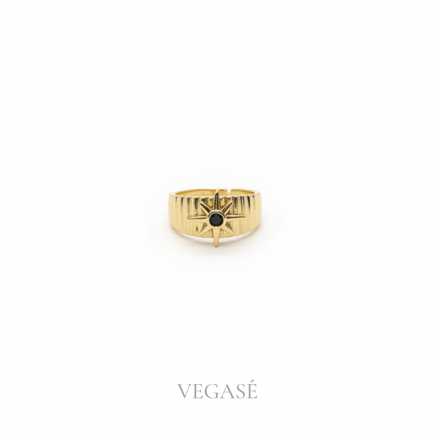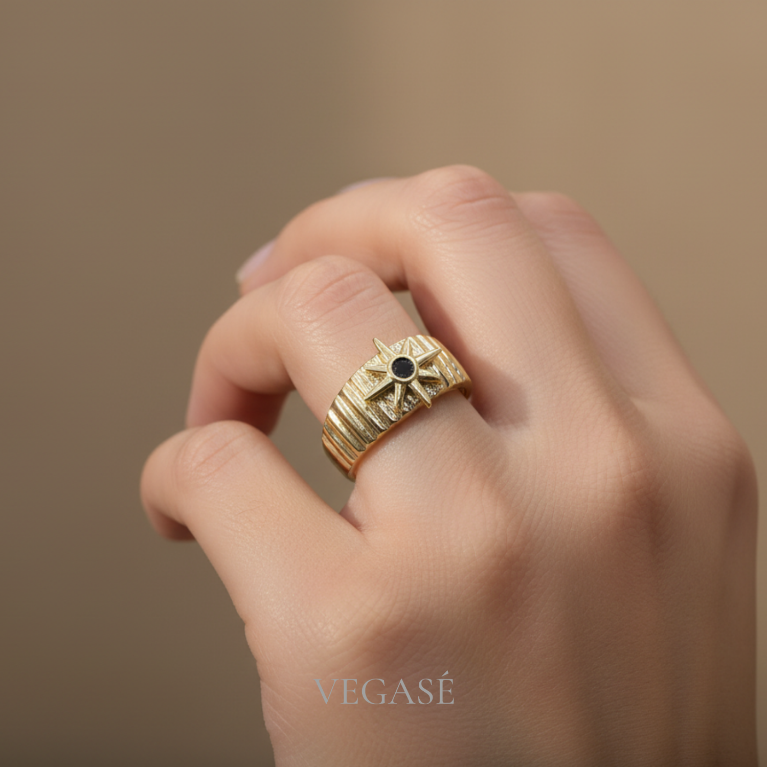 Nova Gold Renk Ayarlanabilir Yıldız Detaylı Yüzük, güçlü ve modern tasarımıyla dikkat çeken özel bir aksesuardır. Ön yüzünde yer alan kabartmalı yıldız formu ve merkezdeki siyah taş detayı, yüzüğe karakterli ve iddialı bir görünüm kazandırır. Gold renk parlak metal yüzeyi ışığı yansıtarak tasarımı daha da ön plana çıkarır.