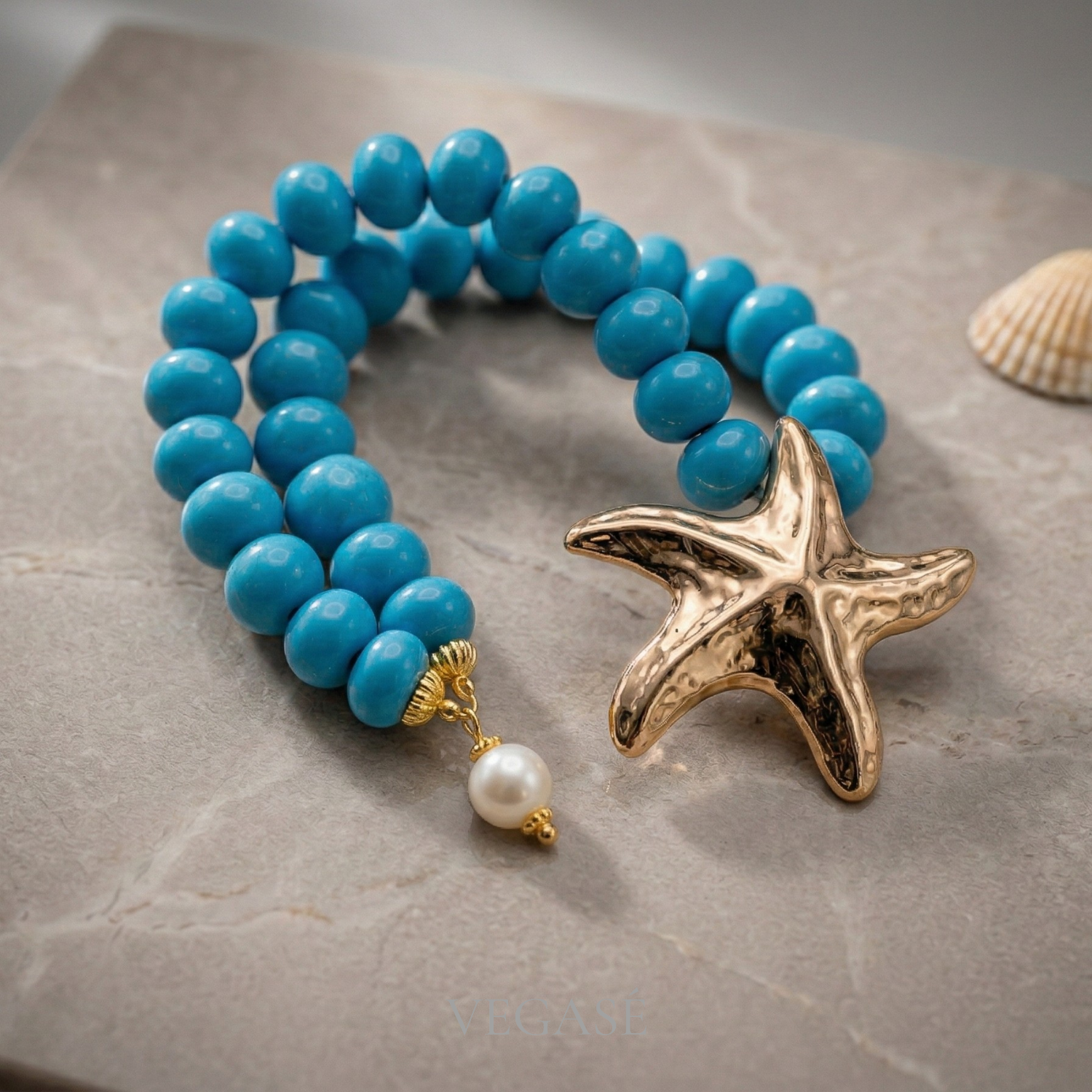 Turkuaz boncuklar ve gold deniz yıldızı detayıyla Riviera Kolye, yaz enerjisini stilinize taşır.