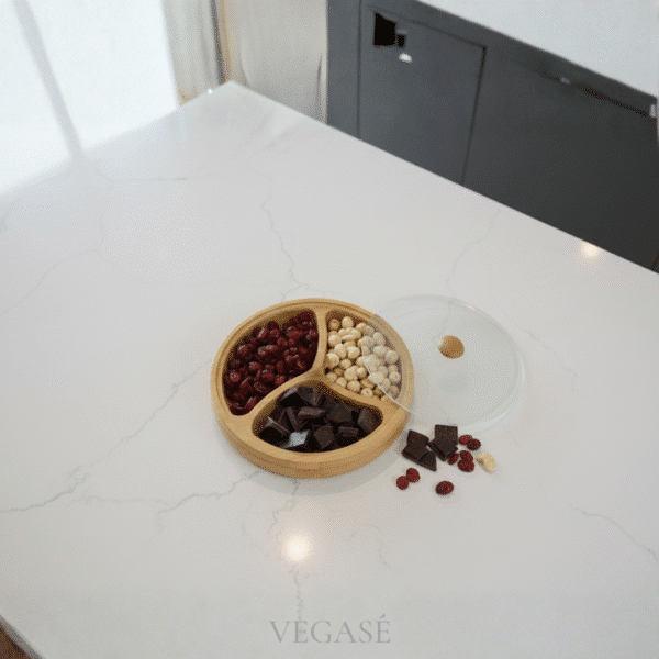 Serena 3 Bölmeli Kapaklı Servis Tabağı; modern tasarımı, doğal bambu dokusu ve pratik kullanımıyla sofralara zarafet katar. Üç ayrı bölmesi sayesinde çerez, kuruyemiş, şekerleme veya atıştırmalıkları düzenli bir şekilde sunmanıza yardımcı olur.