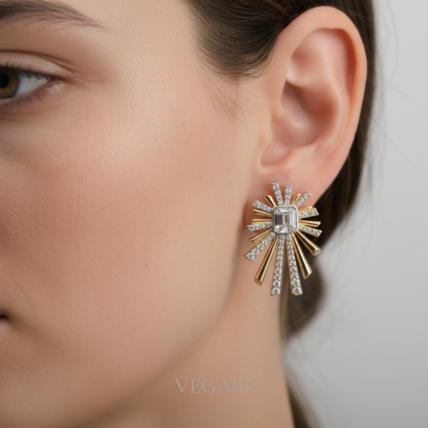 Sunflare Taşlı Küpe, güneşten ilham alan ışın formu ve ışıltılı taş detaylarıyla stilinize güçlü ve sofistike bir parıltı kazandırır.