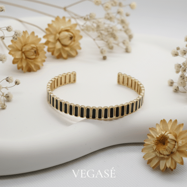 Zarif çizgilerle modern bir şıklık sunan Vegase Tessa Bileklik, gold tonun sıcaklığıyla siyah detayların güçlü kontrastını bir araya getirir. Minimal formu sayesinde hem gündüz hem gece kombinlerine kolayca uyum sağlar.